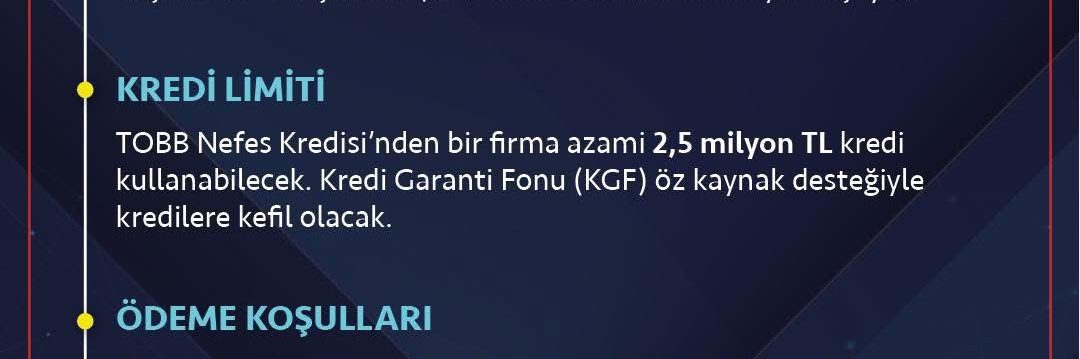 TOBB Nefes Kredisi tekrar başlıyor. Ülkemiz ekonomisinin can damarı KOBİ’lere destek olmak için TOBB, KGF ve Bankalar el ele verdik. KOBİ’lere uygun koşullarda finansman desteği sağlamak amacıyla yeni bir TOBB Nefes Kredisi’ni hayata geçiriyoruz. Başvurular 2 Ekim’de başlıyor.